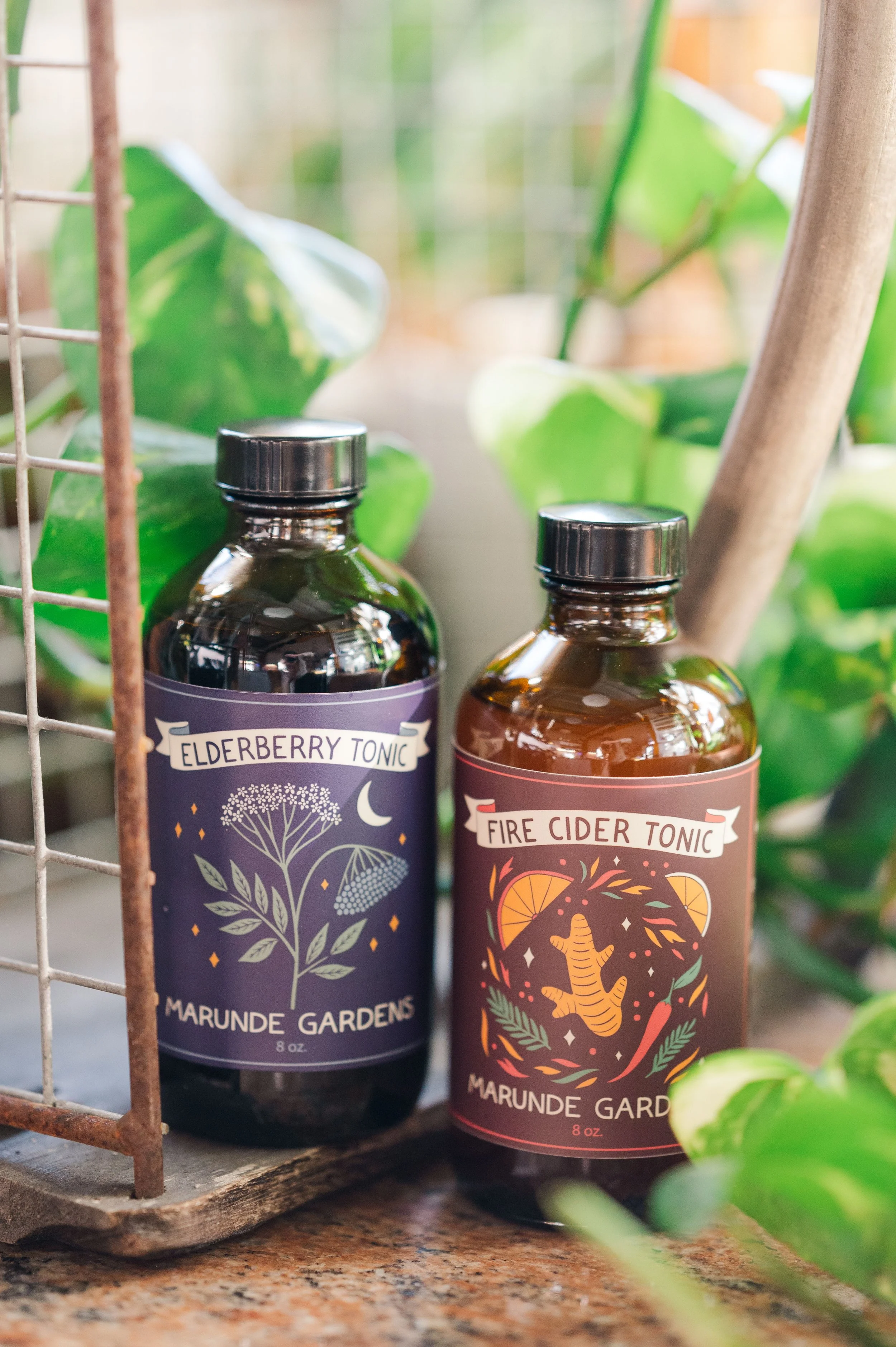 8 oz. tonics come in amber glass bottles with a screw lid